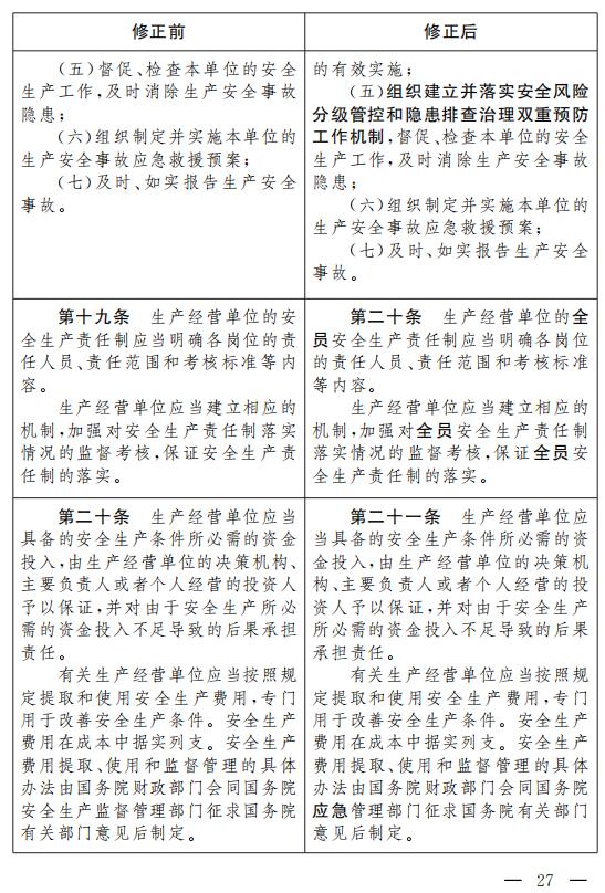 二、將第四條修改為:“生產(chǎn)經(jīng)營單位必須遵守本法和其他有關(guān)安全生產(chǎn)的法律、法規(guī),加強(qiáng)安全生產(chǎn)管理,建立健全全員安全生產(chǎn)責(zé)任制和安全生產(chǎn)規(guī)章制度,加大對安全生產(chǎn)資金、物資、 人員的投入保障力度,改善安全生產(chǎn)條件,加強(qiáng)安全生產(chǎn)標(biāo)準(zhǔn)化建設(shè),構(gòu)建安全風(fēng)險分級管控和隱患排查治理雙重預(yù)防體系,健全風(fēng)險防范化解機(jī)制,提高安全生產(chǎn)水平,確保安全生產(chǎn)。”