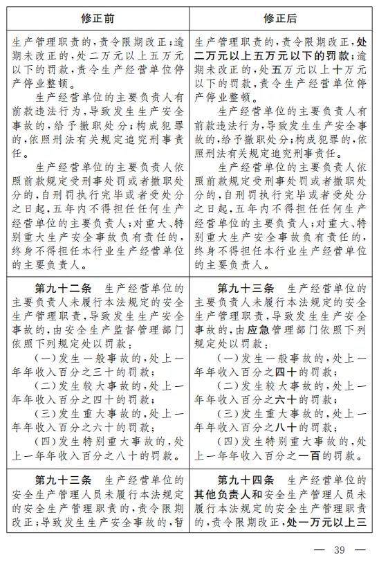 二十四、將第九十二條改為第九十三條,修改為:“生產(chǎn)經(jīng)營單位的主要負(fù)責(zé)人未履行本法規(guī)定的安全生產(chǎn)管理職責(zé),導(dǎo)致發(fā)生生產(chǎn)安全事故的,由應(yīng)急管理部門依照下列規(guī)定處以罰款: