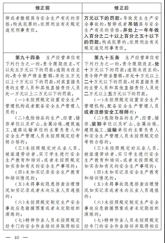 二十六、將第九十四條改為第九十五條,修改為:“生產(chǎn)經(jīng)營單位有下列行為之一的, 責(zé)令限期改正, 處十萬元以下的罰款;逾期未改正的,責(zé)令停產(chǎn)停業(yè)整頓,并處十萬元以上二十萬元以下的罰款,對其直接負(fù)責(zé)的主管人員和其他直接責(zé)任人員處二萬元以上五萬元以下的罰款: