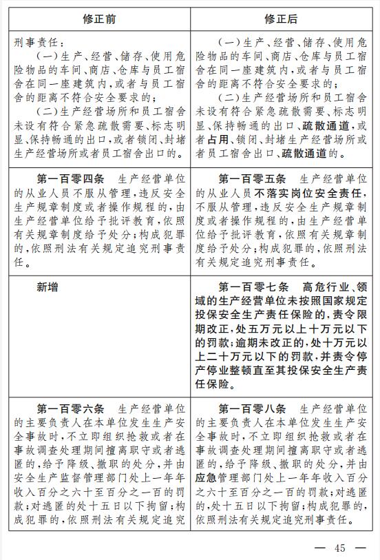 三十一、增加一條,作為第一百零七條:“高危行業(yè)、領(lǐng)域的生產(chǎn)經(jīng)營單位未按照國家規(guī)定投保安全生產(chǎn)責(zé)任保險的,責(zé)令限期改正,處五萬元以上十萬元以下的罰款;逾期未改正的,處十萬元以上二十萬元以下的罰款,并責(zé)令停產(chǎn)停業(yè)整頓直至其投保安全生產(chǎn)責(zé)任保險。”