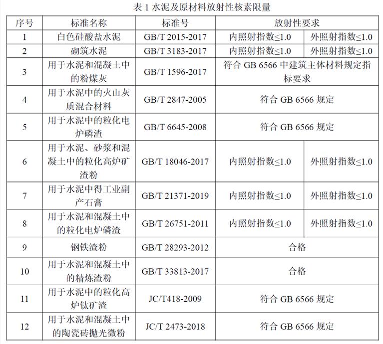 我國從1986年開始,頒布實施了GB 6763 《建筑材料用工業(yè)廢渣放射性物質(zhì)限制標準》等一系列建筑材料放射性物質(zhì)控制標準。2001年首次頒布了GB6566《建筑材料放射性核素限量》標準,2010年進行第一次修訂,為現(xiàn)行有效版本。GB 6566-2010中規(guī)定了建筑主體材料和建筑裝飾裝修材料放射性核素限量值。水泥屬于建筑主體材料,該標準中規(guī)定建筑主體材料中天然放射性核素鐳-226、釷-232、鉀-40的放射性比活度應同時滿足內(nèi)照射指數(shù)不大于1.0和外照射指數(shù)不大于1.0的要求。對空心率大于25%的建筑主體材料,其天然放射性核素鐳-226、釷-232、鉀-40的放射性比活度應同時滿足內(nèi)照射指數(shù)不大于1.0和外照射指數(shù)不大于1.3。我國水泥及原材料產(chǎn)品標準對放射性的要求見下表1。