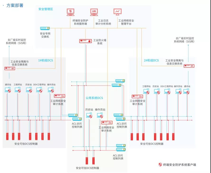 和利時(shí)典型火電控制系統(tǒng)網(wǎng)絡(luò)安全解決方案,遵照等保2.0與能源局36號(hào)文等政策法規(guī)要求,遵循“安全分區(qū)、網(wǎng)絡(luò)專用、橫向隔離、縱向保證”防御體系,針對火電廠監(jiān)控系統(tǒng)進(jìn)行安全防護(hù)設(shè)計(jì)。對火電廠監(jiān)控系統(tǒng)進(jìn)行合理的區(qū)域劃分,通過防護(hù)方案使火電廠生產(chǎn)監(jiān)控系統(tǒng)具有抵御黑客、病毒、惡意代碼等網(wǎng)絡(luò)與應(yīng)用系統(tǒng)的破壞和攻擊,阻止內(nèi)部人員的非法訪問,抵御外部攻擊,在遭受攻擊和破壞后能及時(shí)恢復(fù)系統(tǒng)的能力,確保關(guān)鍵業(yè)務(wù)數(shù)據(jù)的可用性、機(jī)密性、完整性。