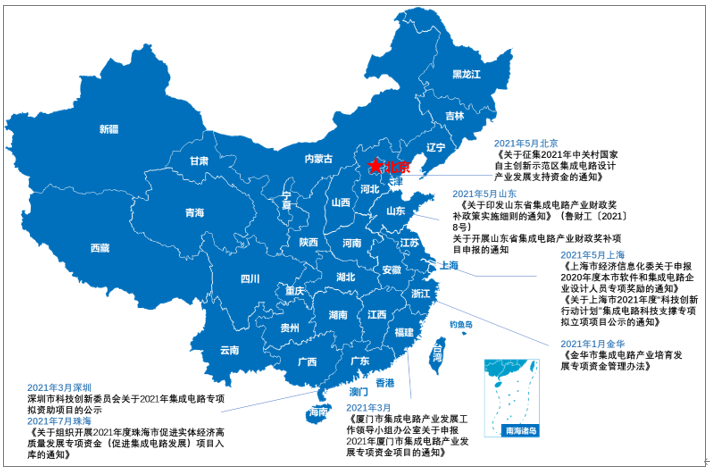 為推動(dòng)集成電路產(chǎn)業(yè)快速發(fā)展,多地針對(duì)集成電路重點(diǎn)科技人員和項(xiàng)目出臺(tái)了獎(jiǎng)勵(lì)和資金支持政策,2021年5月山東省發(fā)布了《關(guān)于印發(fā)山東省集成電路產(chǎn)業(yè)財(cái)政獎(jiǎng)補(bǔ)政策實(shí)施細(xì)則的通知》及《關(guān)于開(kāi)展山東省集成電路產(chǎn)業(yè)財(cái)政獎(jiǎng)補(bǔ)項(xiàng)申報(bào)的通知》兩份文件,文件中對(duì)于實(shí)施細(xì)則和相關(guān)要求做了詳細(xì)的說(shuō)明,除山東省之外,北京、上海、深圳、廈門(mén)、珠海、金華等地均有文件對(duì)項(xiàng)目支持資金相關(guān)領(lǐng)域進(jìn)行詳細(xì)的規(guī)范。