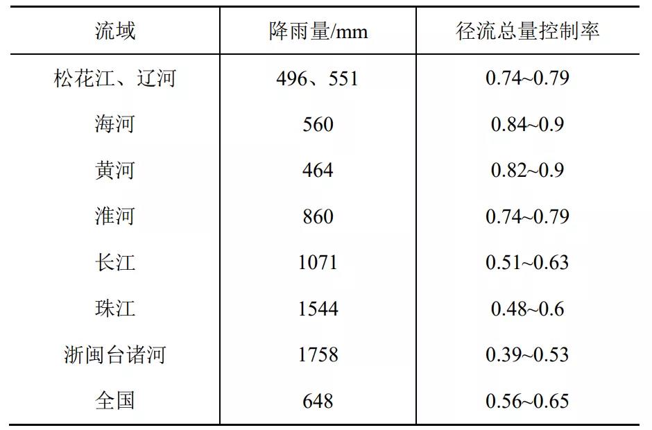 海綿城市建設是基于對自然本底的保護與修復,因此確定徑流總量控制率時必須要掌握城市所在地的降雨自然徑流規律與特點,依此來確定。當地的自然徑流規律和特點與降雨量、下墊面狀況、土壤滲透性以及地下水位等因素有關,可通過多年降雨形成產匯流的水文統計數據推導得出。在海綿城市建設初期推廣時,住建部印發的《海綿城市建設技術指南》中給出了北京建筑大學研究團隊收集國內200多個城市降雨資料統計計算繪制的參考圖,供當時試點城市和各地在確定徑流總量控制率時參考。筆者根據水利部水文局1986年《中國水資源評價》統計數據計算的徑流總量控制率見表2,地處流域中上游的城市可取上限值、下游城市可取下限值。