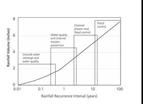 年徑流總量控制率主要是針對中小降雨事件,可依據多年降雨資料導出降雨徑流總量控制率與降雨量的對應關系,其統計計算方法可參考《海綿城市建設技術指南》或《海綿城市建設評價標準》(GB/T51345-2018)。依徑流總量控制率確定的設計降雨水深與徑流控制設施的服務范圍設計降雨徑流控制設施的規模。年徑流總量控制率指標應該通過城市規劃分解到各個排水分區或開發建設的地塊上,再依據建設性詳規具體落實到實施項目上。