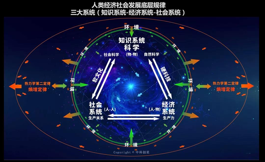 我畫了一張圖,這張圖描述了整個人類社會發展的底層邏輯,我將整個社會分為三大系統——知識系統,經濟系統,社會系統。
