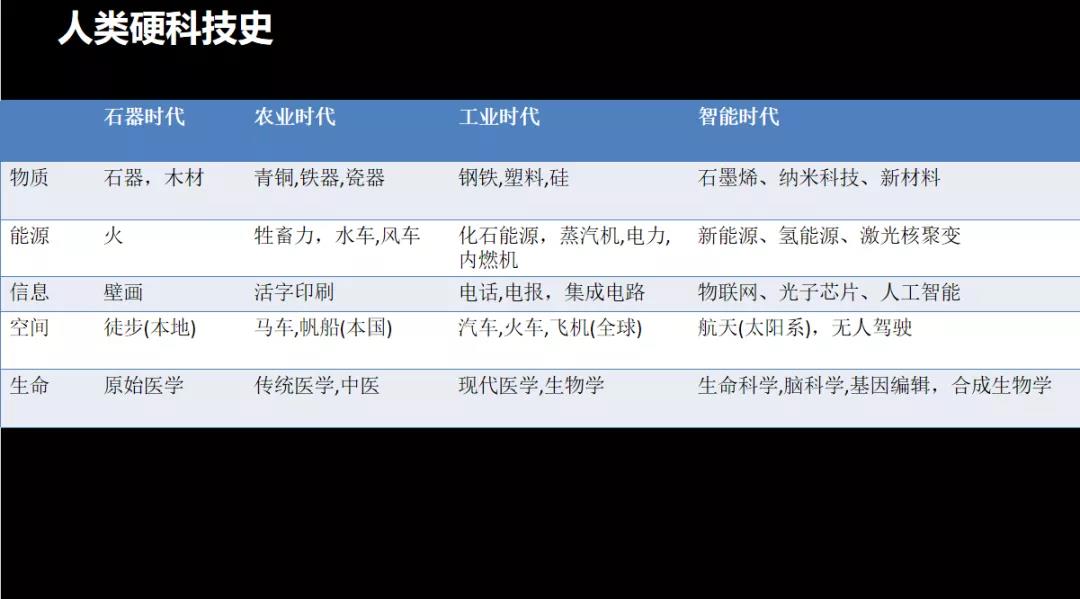 回顧硬科技發展史,我將它分為物質、能量、信息、空間和生命,每一次的工業革命都是物質、能源、信息、空間和生命的革命。