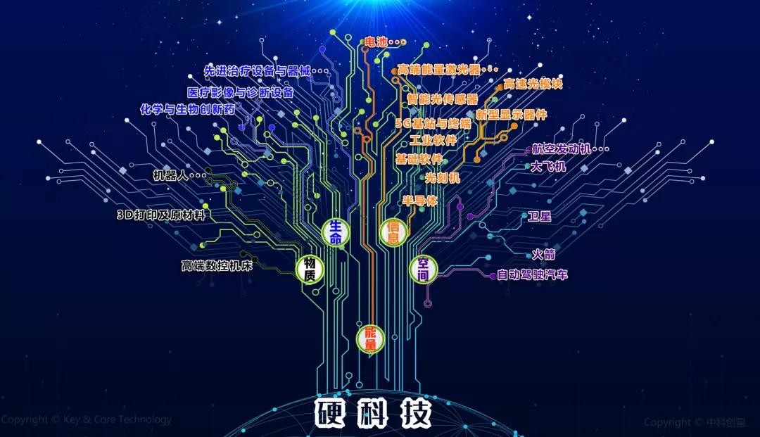 我們一直致力從事推動中國硬科技的發展,我們跟科技部火炬中心共同研究的硬科技課題,在硬科技大會上發布“硬科技樹”在能量、物質、信息、空間、生命五大領域找到了兩百多個子項。其中的關鍵核心技術,我認為都是科創板將來要上市和鼓勵的,也是我們應該去追求的和發展的。