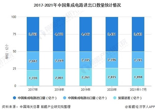 截止至2021年7月,我國累計進口集成電路3683億個;出口集成電路1785億個,貿易逆差為1898億個。
