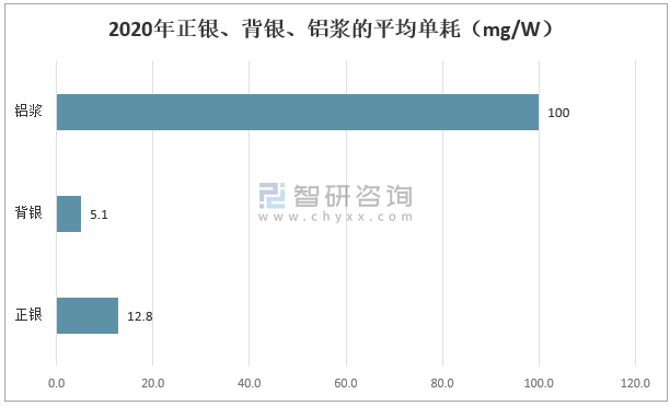 受益于硅片尺寸增大、電池轉(zhuǎn)換效率快速提高以及印刷技術(shù)的進(jìn)步,2020年中國(guó)正銀、背銀、鋁漿的平均單耗分別為12.8mg/W、5.1mg/W、100mg/W,整體降幅明顯。