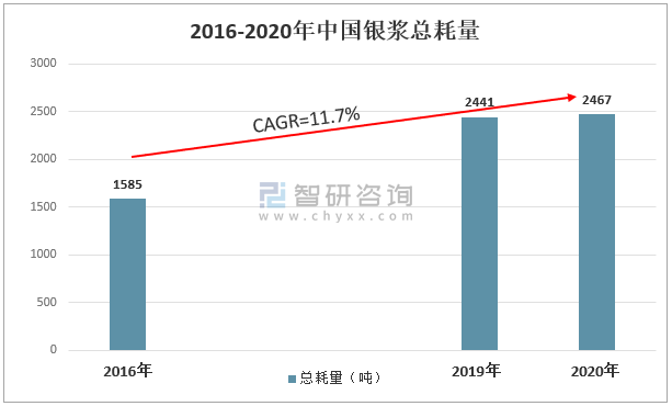 由于光伏裝機(jī)需求的快速增長(zhǎng),中國(guó)光伏銀漿需求整體呈現(xiàn)平穩(wěn)上升態(tài)勢(shì)。中國(guó)光伏銀漿總耗量由2016年的1585噸增加至2020年2467噸,年復(fù)合增長(zhǎng)率為11.7%。