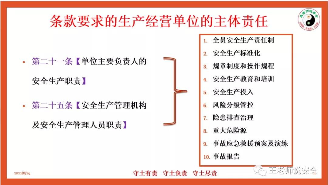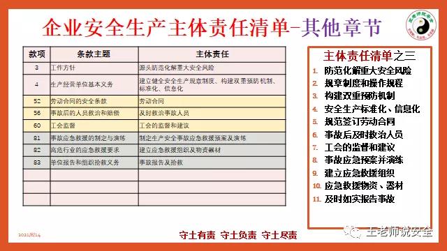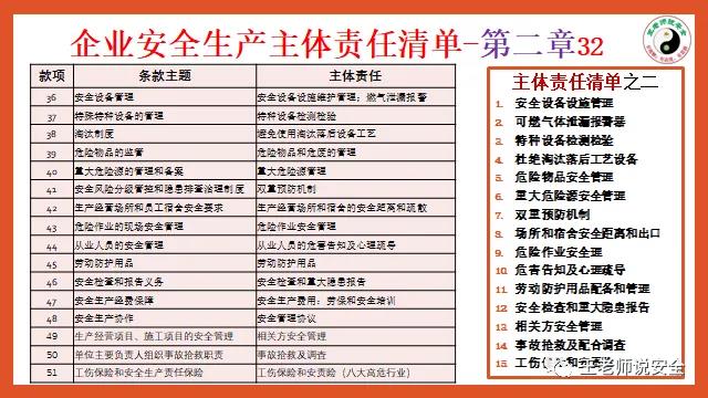 3、在以上清單中,用淺黃色圈出來的9條主體責任,是企業的主要負責人和安全生產管理人員的相關職責;鑒于其要求本身和盡職履責的重要性,特別做了提示。