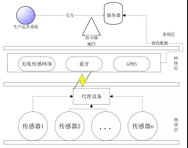 生產運營系統的技術框架分為三層:物理層、網絡層、系統層。其中,物理層負責數據采集,主要通過布置在生產現場的傳感器或者PLC對數據進行采集;網絡層負責數據的傳輸;系統層主要包括服務端和應用端,是整個系統的軟件部分。
