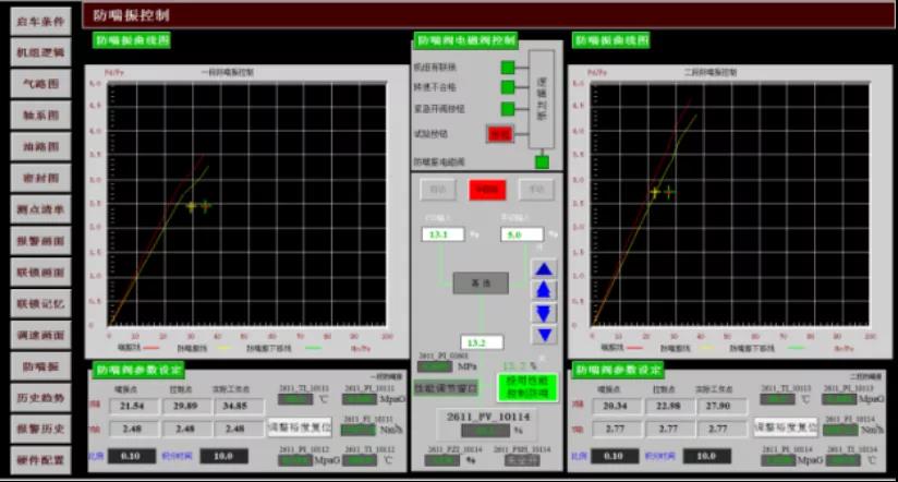 某石化160萬噸年焦化裝置氣壓機組。通過增加分餾塔頂壓力自動耦合控制汽輪機轉速及防喘振閥,即使在機組低負荷時也能實現壓(防喘振控制線)線運行,工藝操作可根據工況調整設定點,機組控制系統就能實現全自動優化運行,達到了壓縮機的最佳工作工況和穩定運行。
