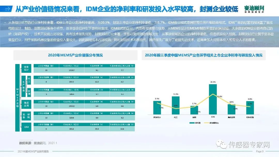看投資收益、發(fā)展前景,實(shí)事求是的講,現(xiàn)在MEMS行業(yè)凈利潤(rùn)率并不高,10%左右,IDM凈利潤(rùn)率最高,超過20%,代工行業(yè)利潤(rùn)率比較高,達(dá)到12%。在研發(fā)投入上,研發(fā)能力遠(yuǎn)遠(yuǎn)不足,基本上在10%,IDM比較高,超過了10%。