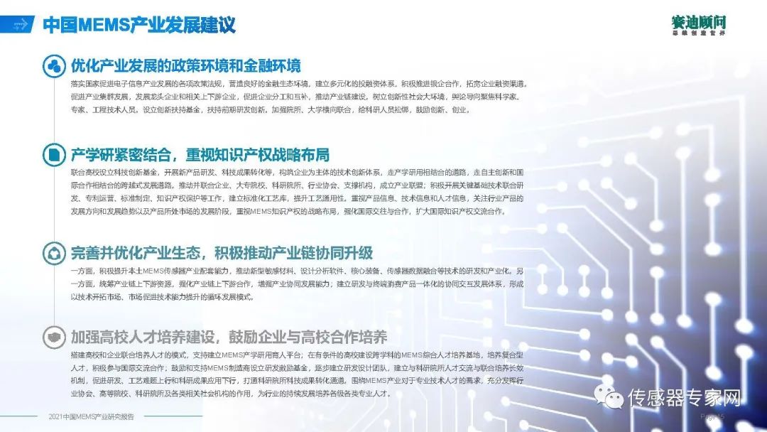 3、完善并優(yōu)化產(chǎn)業(yè)生態(tài),積極推動(dòng)產(chǎn)業(yè)鏈協(xié)同升級(jí),一方面,積極提升本土MEMS傳感器產(chǎn)業(yè)配套能力,推動(dòng)新型敏感材料、設(shè)計(jì)分析軟件、核心裝備、傳感器數(shù)據(jù)融合等技術(shù)的研發(fā)和產(chǎn)業(yè)化。另一方面,統(tǒng)籌產(chǎn)業(yè)鏈上下游資源,強(qiáng)化產(chǎn)業(yè)鏈上下游合作,增強(qiáng)產(chǎn)業(yè)協(xié)同發(fā)展能力。