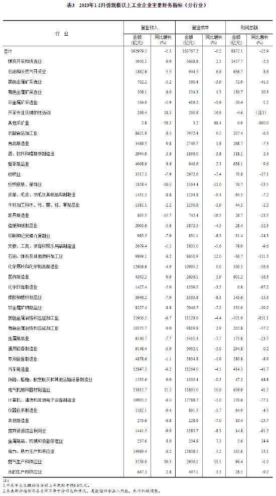 1—2月份,全國規模以上工業企業實現利潤總額8872.1億元,同比下降22.9%。1—2月份,規模以上工業企業中,國有控股企業實現利潤總額3449.1億元,同比下降17.5%;股份制企業實現利潤總額6719.0億元,下降19.4%;外商及港澳臺商投資企業實現利潤總額1761.3億元,下降35.7%;私營企業實現利潤總額2559.3億元,下降19.9%。1—2月份,采礦業實現利潤總額2343.7億元,同比下降0.1%;制造業實現利潤總額5837.8億元,下降32.6%;電力、熱力、燃氣及水生產和供應業實現利潤總額690.6億元,增長38.6%。1—2月份,在41個工業大類行業中,10個行業利潤總額同比增長,1個行業減虧,28個行業下降,2個行業由盈轉虧。主要行業利潤情況如下:電力、熱力生產和供應業利潤總額同比增長53.1%,電氣機械和器材制造業增長41.5%,石油和天然氣開采業增長8.6%,通用設備制造業增長0.2%,煤炭開采和洗選業下降2.3%,農副食品加工業下降6.3%,專用設備制造業下降8.9%,紡織業下降37.1%,非金屬礦物制品業下降39.2%,汽車制造業下降41.7%,化學原料和化學制品制造業下降56.6%,有色金屬冶煉和壓延加工業下降57.2%,計算機、通信和其他電子設備制造業下降77.1%,石油煤炭及其他燃料加工業、黑色金屬冶煉和壓延加工業均由盈利轉為虧損。1—2月份,規模以上工業企業實現營業收入19.30萬億元,同比下降1.3%;發生營業成本16.38萬億元,下降0.2%;營業收入利潤率為4.60%,同比下降1.29個百分點。2月末,規模以上工業企業資產總計156.50萬億元,同比增長8.2%;負債合計88.91萬億元,增長8.7%;所有者權益合計67.60萬億元,增長7.6%;資產負債率為56.8%,同比上升0.2個百分點。2月末,規模以上工業企業應收賬款21.23萬億元,同比增長10.9%;產成品存貨5.99萬億元,增長10.7%。1—2月份,規模以上工業企業每百元營業收入中的成本為84.86元,同比增加0.90元;每百元營業收入中的費用為8.51元,同比增加0.20元。
