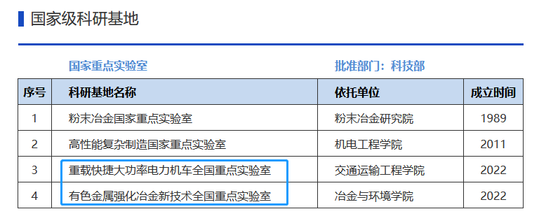 中南大學(xué)官網(wǎng)信息顯示,中南大學(xué)擁有“重載快捷大功率電力機車全國重點實驗室”和“有色金屬強化冶金新技術(shù)全國重點實驗室”;此外,3月15日,中南大學(xué)極端服役性能精準(zhǔn)制造全國重點實驗室發(fā)布《極端服役性能精準(zhǔn)制造全國重點實驗室2023年自主研究課題申請指南》,表明中南大學(xué)還擁有“極端服役性能精準(zhǔn)制造全國重點實驗室”。