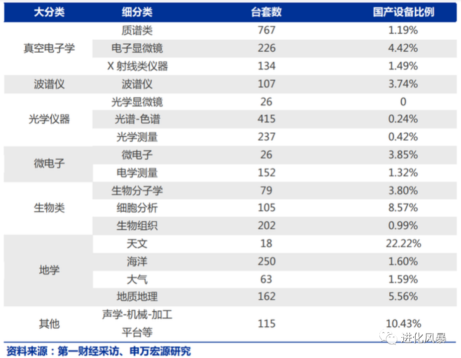 2016-2019 年間,中科院下屬研究所采購的200萬以上的科學儀器中,國產(chǎn)質譜儀、X 射線類儀器、光學色譜儀、光學顯微鏡比例不足 1.5%,其中,光學顯微鏡國產(chǎn)采購率為0。類似核磁共振波譜儀、液質聯(lián)用儀、X射線衍射儀的“國貨”占比率,僅為0.99%、1.19%、1.32%。