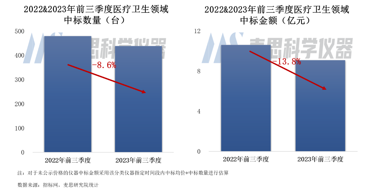 2023年前三季度質(zhì)譜儀器在醫(yī)療衛(wèi)生領域的中標數(shù)量達到438臺,同比下降8.6%。中標市場規(guī)模約9.1億,同比下降13.8%。