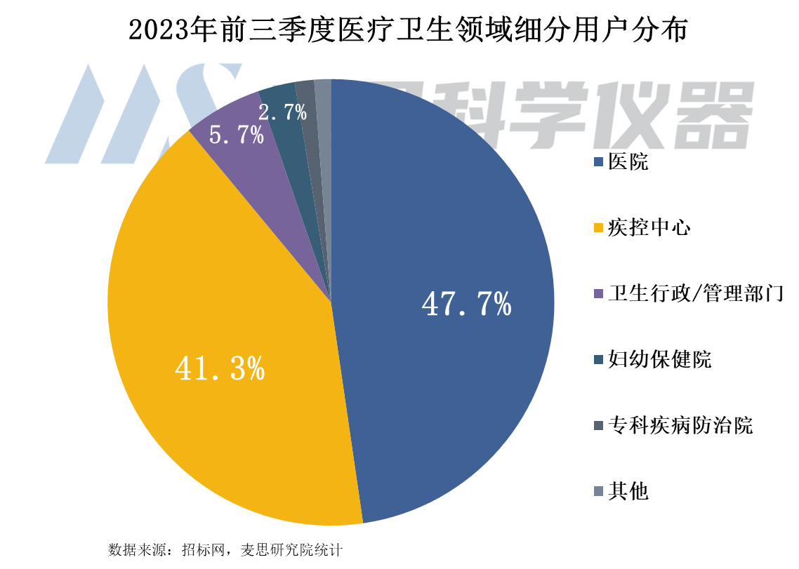 從醫(yī)療衛(wèi)生領域各客戶類型采購質(zhì)譜儀器的數(shù)量來看,醫(yī)院采購量占比排名第一,占比47.7%。其次是疾控中心,占比41.3%。