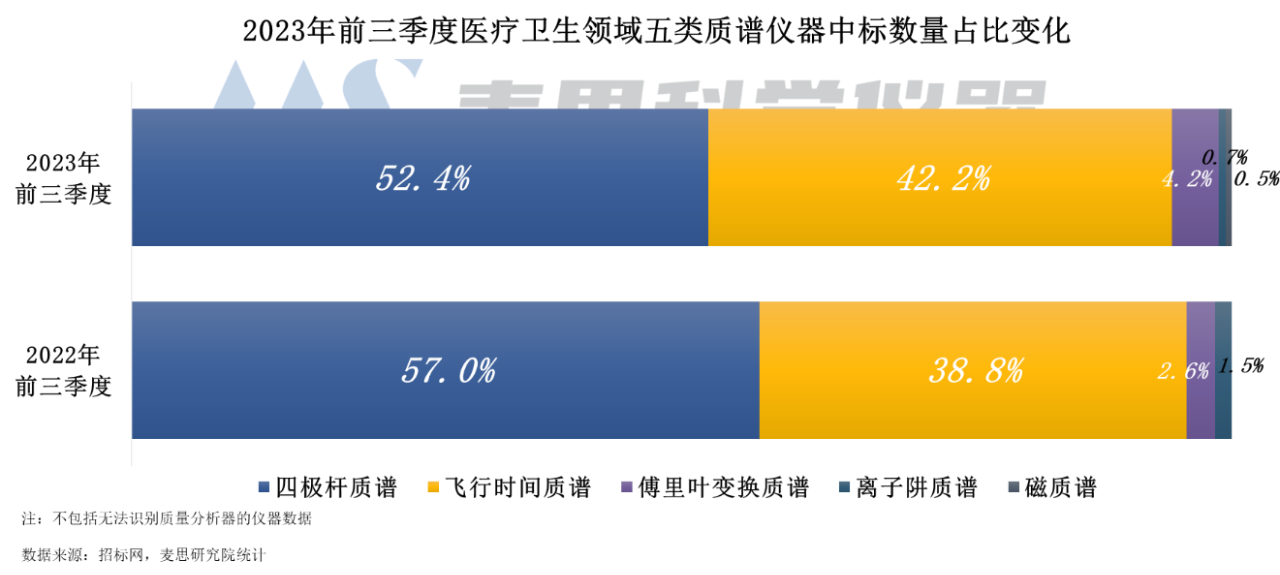 從各技術路線看,2023年前三季度醫(yī)療衛(wèi)生領域中標質(zhì)譜主要為四極桿質(zhì)譜和飛行時間質(zhì)譜,合計占比高達95%。其中四極桿質(zhì)譜中標數(shù)量最多,占比52.4%,但同比減少4.6個百分點;其次是飛行時間質(zhì)譜,占比42.2%,同比增加3.4個百分點;傅里葉變換質(zhì)譜占比4.2%,同比增加1.6個百分點。離子阱質(zhì)譜、磁質(zhì)譜中標數(shù)量極少。