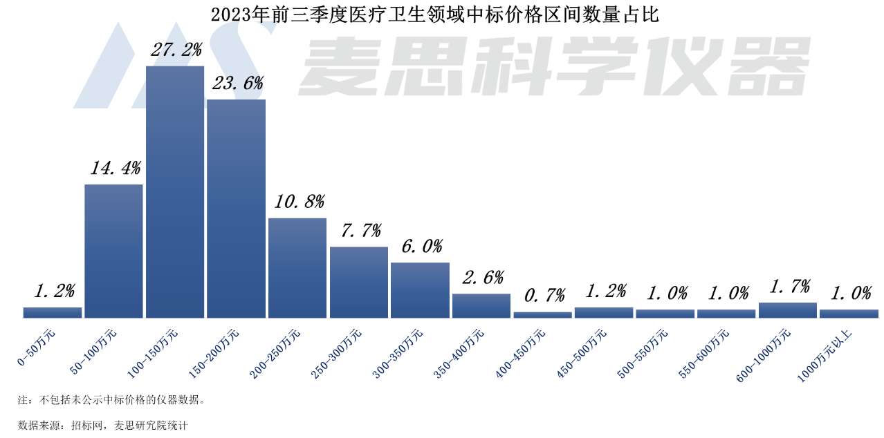 從各價格區(qū)間的中標數(shù)量占比來看,醫(yī)療衛(wèi)生領域質(zhì)譜儀器中標單價基本在50-350萬元之間,占比約90%。其中,單價在100-150萬元以內(nèi)的質(zhì)譜儀器數(shù)量最多,2023年前三季度中標數(shù)量占比約27.2%。