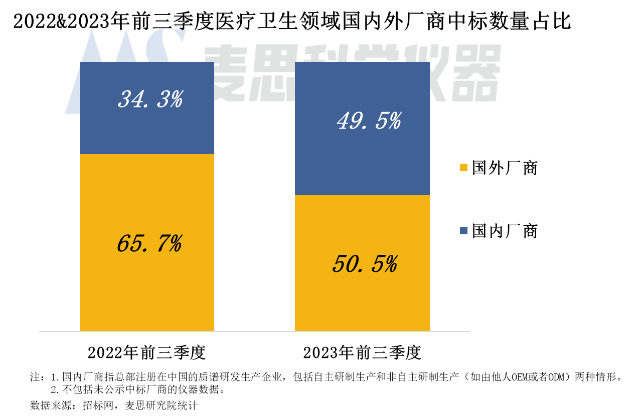 質(zhì)譜儀器中標數(shù)量國產(chǎn)化率較高,與國外廠商中標數(shù)量占比僅有1個百分點的差距。與2022年同期對比,2023年前三季度國內(nèi)廠商在醫(yī)療衛(wèi)生領域的中標數(shù)量占比增長顯著,從34.3%增加至49.5%,增幅15個百分點。