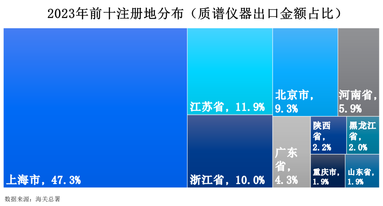 2023年質譜儀器出口額前十注冊地分別為上海市、江蘇省、浙江省、北京市、河南省、廣東省、陜西省、黑龍江省、重慶市和山東省,占比分別為47.3%、11.9%、10.0%、9.3%、5.9%、4.3%、2.2%、2.0%、1.9%和1.9%。