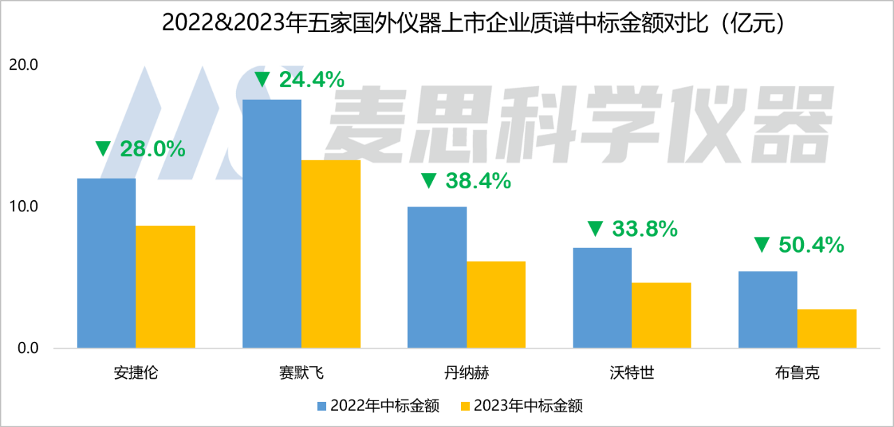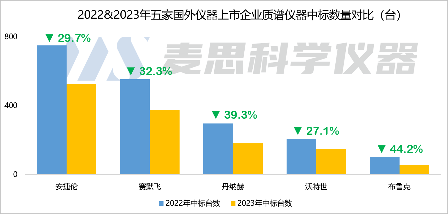 從中標(biāo)數(shù)據(jù)來看,雖然2023年上述五家國(guó)外企業(yè)進(jìn)入了中國(guó)質(zhì)譜儀器中標(biāo)市場(chǎng)的TOP 10廠商行列,但他們中標(biāo)數(shù)量和中標(biāo)金額同比都有比較明顯的下降。