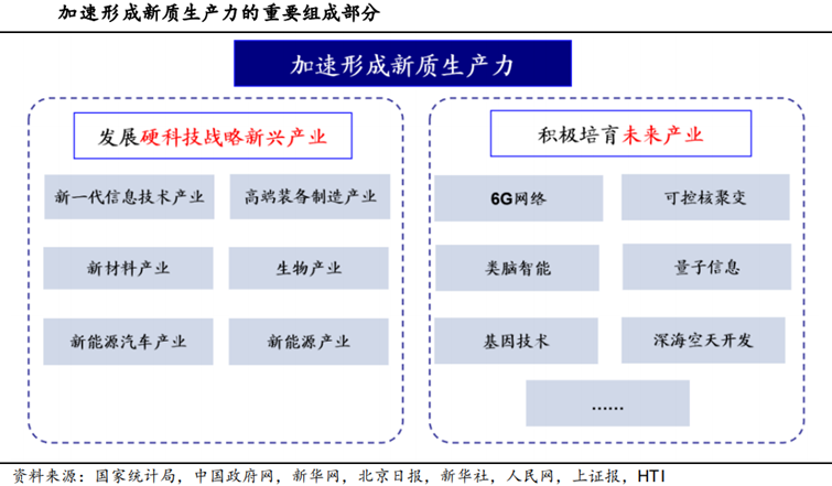 新質(zhì)生產(chǎn)力的核心在于整合科技創(chuàng)新資源,一方面引領(lǐng)發(fā)展戰(zhàn)略性新興產(chǎn)業(yè),國家統(tǒng)計(jì)局發(fā)布的《戰(zhàn)略性新興產(chǎn)業(yè)分類(2018)》中有新一代信息技術(shù)產(chǎn)業(yè)、高端裝備制造產(chǎn)業(yè)、新材料產(chǎn)業(yè)、生物產(chǎn)業(yè)、新能源汽車產(chǎn)業(yè)、新能源產(chǎn)業(yè)六大產(chǎn)業(yè)和硬科技的概念不謀而合;另一方面積極培育未來產(chǎn)業(yè),在6G網(wǎng)絡(luò)、可控核聚變、類腦智能、量子信息、基因技術(shù)、深海空天開發(fā)等前沿科技和產(chǎn)業(yè)變革領(lǐng)域贏得發(fā)展主動(dòng)權(quán),從而以硬科技創(chuàng)新帶動(dòng)新經(jīng)濟(jì)增長點(diǎn)不斷涌現(xiàn)。