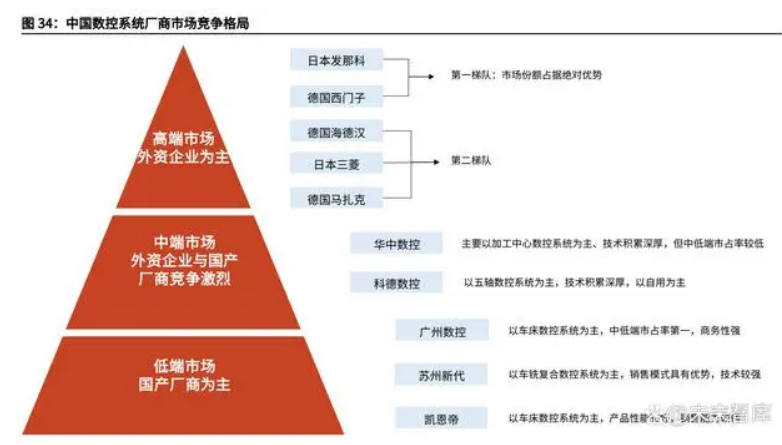 自 2017 年中國科技專項后,數控系統國產化率實現提升,打破高端市場外資壟 斷局面,但目前中高端市場仍以外資為主,這主要是由于數控系統的技術壁壘與 較高的用戶粘性。目前中國數控系統市場中:高端市場以外資企業為主,其中第一梯隊代表為日本發那科、德國西門子,第二 梯隊代表為德國海德漢、日本三菱、德國馬扎克;中端市場面臨外資企業與國產廠商的激烈競爭,其中國產品牌華中數控主要以加 工中心數控系統為主、技術積累深厚,科德數控以五軸數控系統為主,技術積累 深厚,以自用為主;低端市場以國產廠商為主,如廣州數控(以車床數控系統為主,中低端市占率第一,商務性強)、蘇州新代(以車銑復合數控系統為主,銷售模式具有優勢,技 術較強)、凱恩帝(以車床數控系統為主,產品性能較好,銷售能力較弱)。