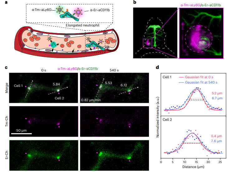 其中,團(tuán)隊(duì)利用開(kāi)發(fā)的新型近紅外二區(qū)稀土熒光探針特異性的標(biāo)記了小鼠的中性粒細(xì)胞以研究炎癥血管中活化中性粒細(xì)胞的體內(nèi)成像(圖2)。中性粒細(xì)胞能夠在血管內(nèi)壁爬行到外滲部位,然后外滲是中性粒細(xì)胞活化的典型特征。CD11b是一種介導(dǎo)細(xì)胞粘附和遷移的中性粒細(xì)胞表面蛋白,在活化的中性粒細(xì)胞表面表達(dá)上調(diào)。中性粒細(xì)胞上Ly6G和CD11b蛋白的雙重標(biāo)記有助于在體內(nèi)特異性地跟蹤活化的中性粒細(xì)胞。因此,在缺血性腦卒中小鼠模型中,靜脈注射抗ly6g抗體偶聯(lián)的α-TmNPs和抗cd11b抗體偶聯(lián)的α-ErNPs (α-Er-aCD11b),標(biāo)記活化的中性粒細(xì)胞,雙標(biāo)記的中性粒細(xì)胞表現(xiàn)出微弱的運(yùn)動(dòng)、滾動(dòng)和爬行,表明它們?cè)趦?nèi)皮細(xì)胞表面粘附牢固。此外,可以觀察到雙標(biāo)記的中性粒細(xì)胞,沿著血流的剪切力被拉長(zhǎng),這通常被認(rèn)為是中性粒細(xì)胞通過(guò)炎癥血管外滲的最后一步。