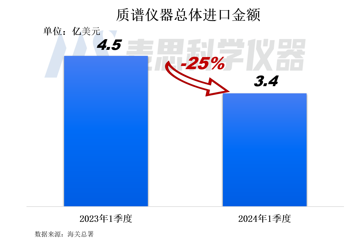 2024年1季度我國(guó)質(zhì)譜儀器(含質(zhì)譜聯(lián)用儀和其他質(zhì)譜儀)進(jìn)口金額為3.4億美元(約合人民幣24億元),同比下降25%,這是2021年以來(lái)同期進(jìn)口額首次出現(xiàn)下滑。
