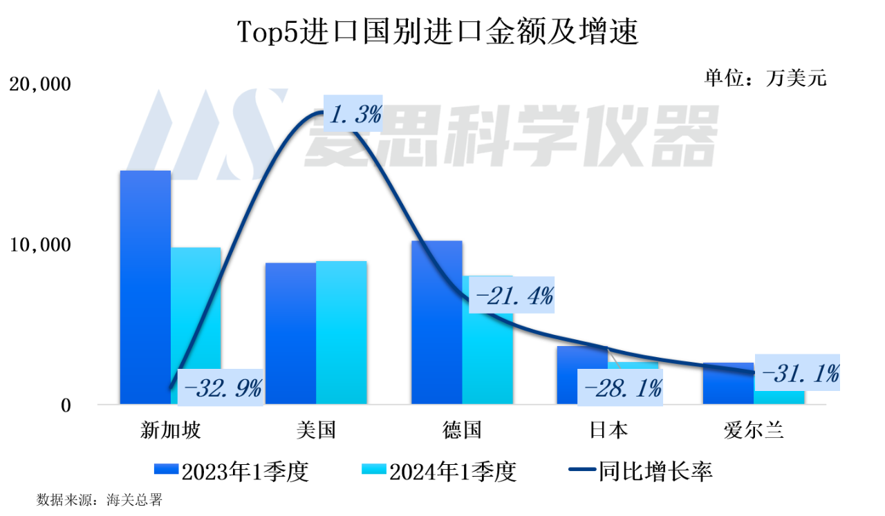 從2024年1季度質(zhì)譜儀器進(jìn)口國(guó)別結(jié)構(gòu)看,排名前五位為新加坡、德國(guó)、美國(guó)、日本以及愛(ài)爾蘭,進(jìn)口金額占比分別為28.8%、26.3%、23.6%、7.7%以及5.3%。