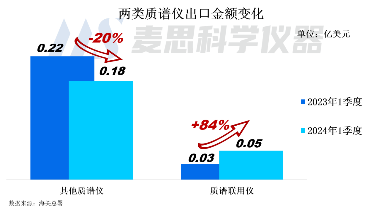 2024年1季度我國(guó)質(zhì)譜儀器出口金額為2300萬(wàn)美元(約合人民幣1.64億元),同比下降8%。