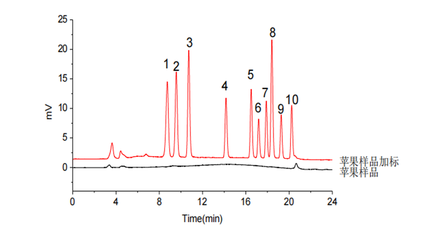 實際樣品(蘋果基質)中的10中氨基甲酸酯類農殘回收率均在84.15% ~ 100.37%之間,RSD值均小于4.35%,充分說明該方法結果準確,穩定可靠。