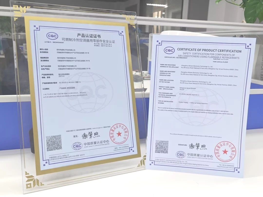 座談會上,CQC和UL Solutions的專家們深入探討了國際家電產品認證的發展趨勢、標準要求以及市場準入策略。并現場頒發了首批國際合作項目認證證書,鄭州煒盛電子科技有限公司榮幸成為首批獲證企業之一,也是制冷劑傳感器領域首家獲證企業,標志著公司在可燃制冷劑空調器用零部件安全認證領域邁出了堅實的步伐。