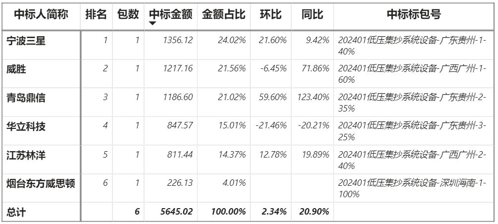 總金額5645.02萬元,6家企業(yè)實現(xiàn)中標,三星中標最大標包1356.12萬元;