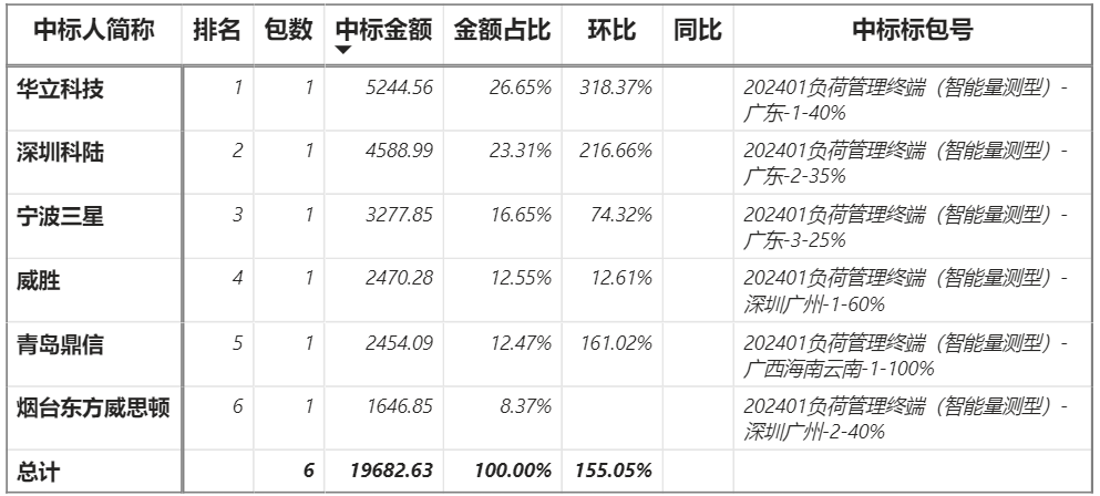 總金額14.29億元,20家企業(yè)實現(xiàn)中標;南網(wǎng)科技、威勝、鼎信、深國電、三星、海興中標2包;