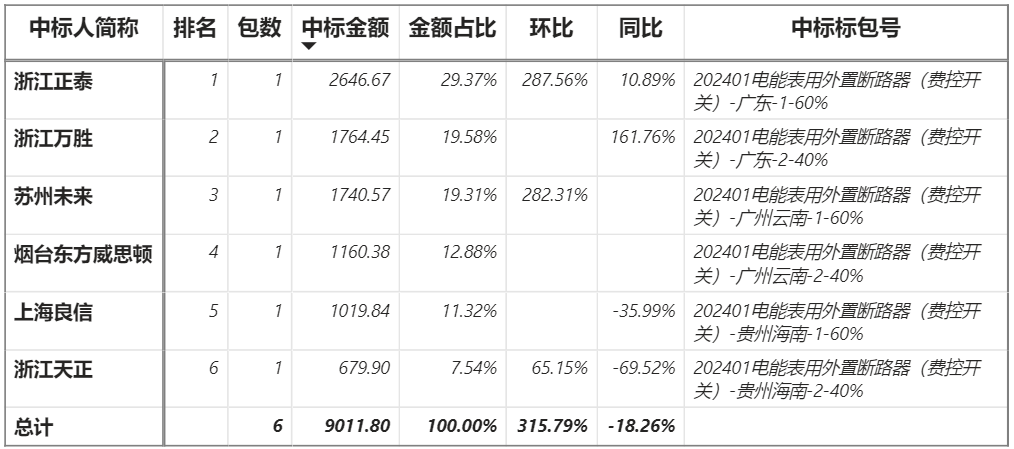 總金額9011.80萬元,6家企業(yè)實現(xiàn)中標,正泰中標最大標包2646.67萬元;