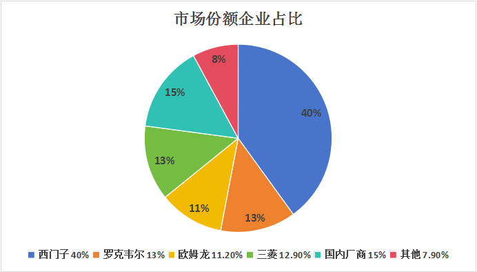 在全球PLC市場上,西門子、三菱電機、歐姆龍、施耐德和ABB等巨頭長期占據主導地位。在2023年,西門子以高達40%的市場份額穩坐榜首,緊隨其后的是羅克韋爾、歐姆龍、三菱電機等廠商,詳細占比參見下圖: