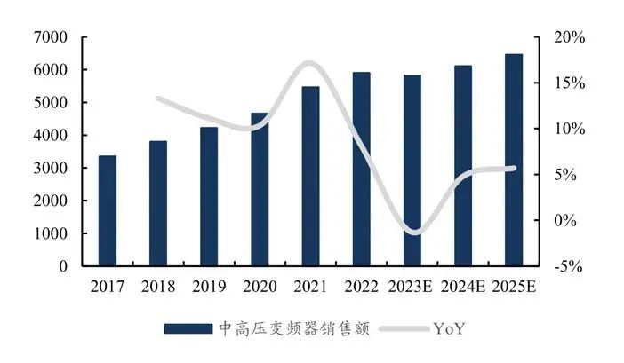 在中高壓變頻器市場中,2020年~2022年,我國中高壓變頻器市場規模同比增長率分別達到了10%、17%和8%,年復合增長率達到了13%,顯示出強勁的增長動力。