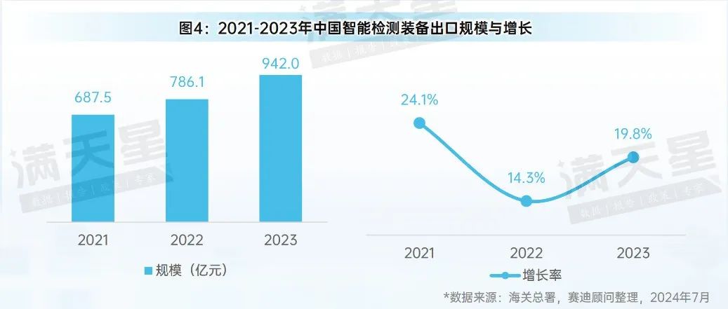 圖4:2021-2023年中國智能檢測裝備出口規模與增長