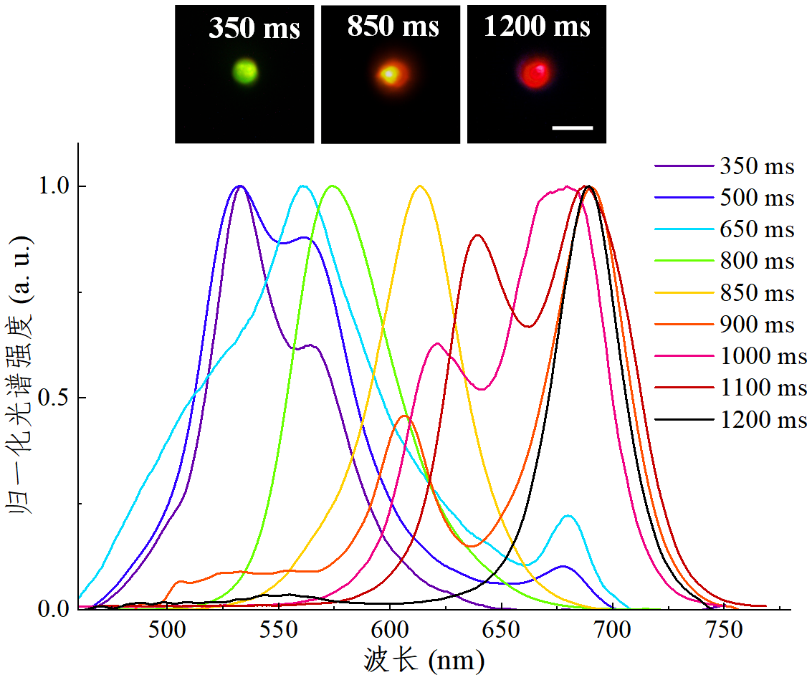 利用超快激光誘導(dǎo)的納米液相分離過程可以實(shí)現(xiàn)納米晶的發(fā)光帶隙的直寫調(diào)控,該技術(shù)方案允許在同一片玻璃內(nèi)部直寫發(fā)光波長組合可調(diào)的納米晶圖案,可用于多維的信息編碼和防偽。如圖3(a)~(c)所示,通過該技術(shù)可以在玻璃內(nèi)部直寫綠色、黃色和紅色的浙江大學(xué)校徽。在此基礎(chǔ)上,使用不同的激光參數(shù)在對應(yīng)鹵素?fù)诫s玻璃中可以實(shí)現(xiàn)彩色圖案的直寫。