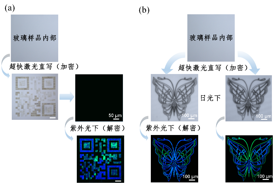 利用超快激光直寫的方法可以在在同一片玻璃內(nèi)部三維直寫發(fā)光波長組合可調(diào)的納米晶圖案,該技術(shù)可以用于創(chuàng)建快速響應(yīng)的二維碼,直寫帶有加密信息的數(shù)據(jù)圖案,如圖6(a)所示。基于納米晶發(fā)光波長的可調(diào)節(jié)性,在圖案的不同區(qū)域可以指定其發(fā)光色彩(例如藍(lán)色和綠色),且這種顏色分布差異在日光下并不可見,只能在紫外光照射下觀察到。如圖6(b)所示,在日光下直寫的“蝴蝶”圖案沒有顯著差異,但在紫外光下圖案在不同區(qū)域呈現(xiàn)不同顏色。與其它基于鈣鈦礦納米晶的加密標(biāo)簽相比,玻璃中直寫的納米晶具有顯著的光穩(wěn)定性和熱穩(wěn)定性,更加適用于關(guān)鍵信息的加密和解密。
