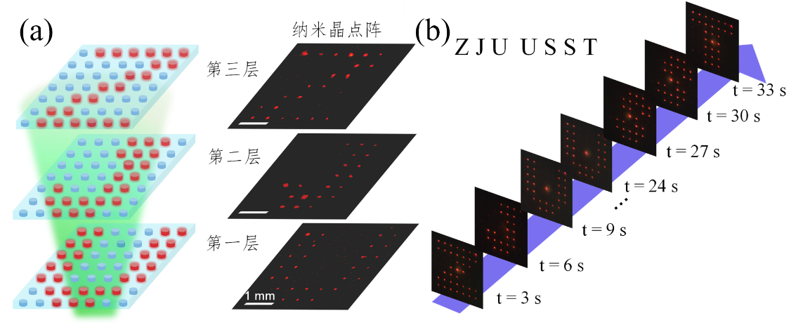 除二維的平面顯示外,該技術(shù)方案還能演示三維的全息顯示器件。將立體的圖案通過空間光調(diào)制器設(shè)計(jì)的全息圖在多個(gè)平面上分層顯示,可以同時(shí)激發(fā)點(diǎn)亮不同層的圖案。如圖 5(a)所示,三幅全息圖像(字母Z、J和U)激發(fā)的熒光圖案在沿激發(fā)光輻照方向上的多個(gè)平面上同時(shí)被構(gòu)建,在不同層顯示了對應(yīng)的字母Z、J和U的紅色熒光圖案。預(yù)先設(shè)置好的全息圖案的播放時(shí)間和順序,在內(nèi)部具有多個(gè)納米晶發(fā)光單元陣列的玻璃基板上還能實(shí)現(xiàn)動態(tài)的全息顯示,如圖5(b)在不同時(shí)刻分別顯示了字母Z、J、U、U、S、S、T的熒光圖案。