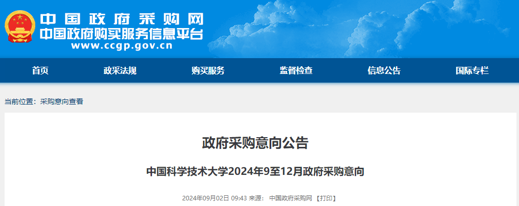 為便于供應商及時了解政府采購信息,根據《財政部關于開展政府采購意向公開工作的通知》(財庫〔2020〕10號)等有關規定,現將中國科學技術大學2024年9至12月政府采購意向公開如下: