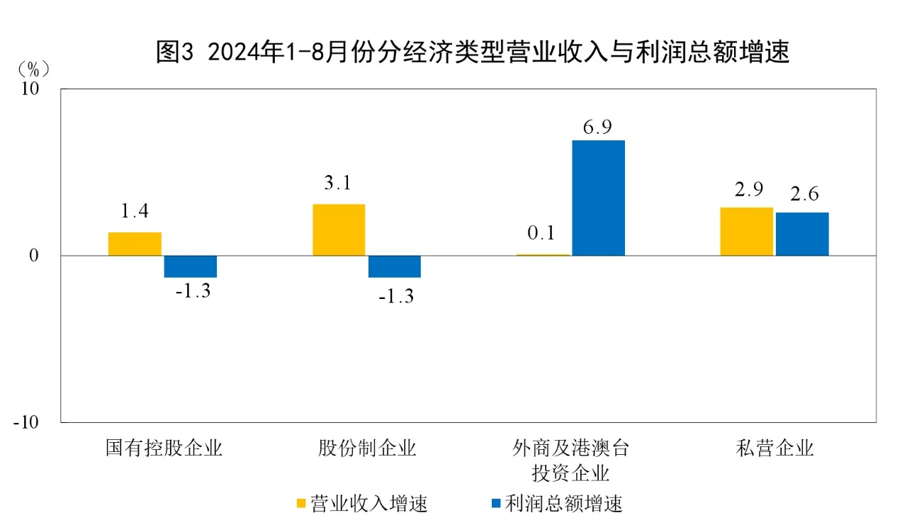 1—8月份,規模以上工業企業中,國有控股企業實現利潤總額15490.6億元,同比下降1.3%;股份制企業實現利潤總額34430.3億元,下降1.3%;外商及港澳臺投資企業實現利潤總額11777.0億元,增長6.9%;私營企業實現利潤總額12648.3億元,增長2.6%