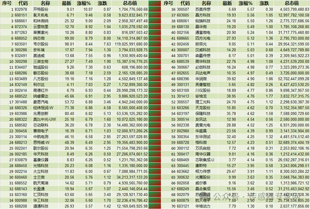 具體到中國傳感器產業鏈,70只傳感器核心產業鏈企業中,全部上漲,無一家傳感器上市股票下跌——歷史罕見。70只傳感器股票平均漲幅5.77%,總市值達到9453.23億元,而漲幅TOP 10傳感器股票的平均漲幅達到8.65%。